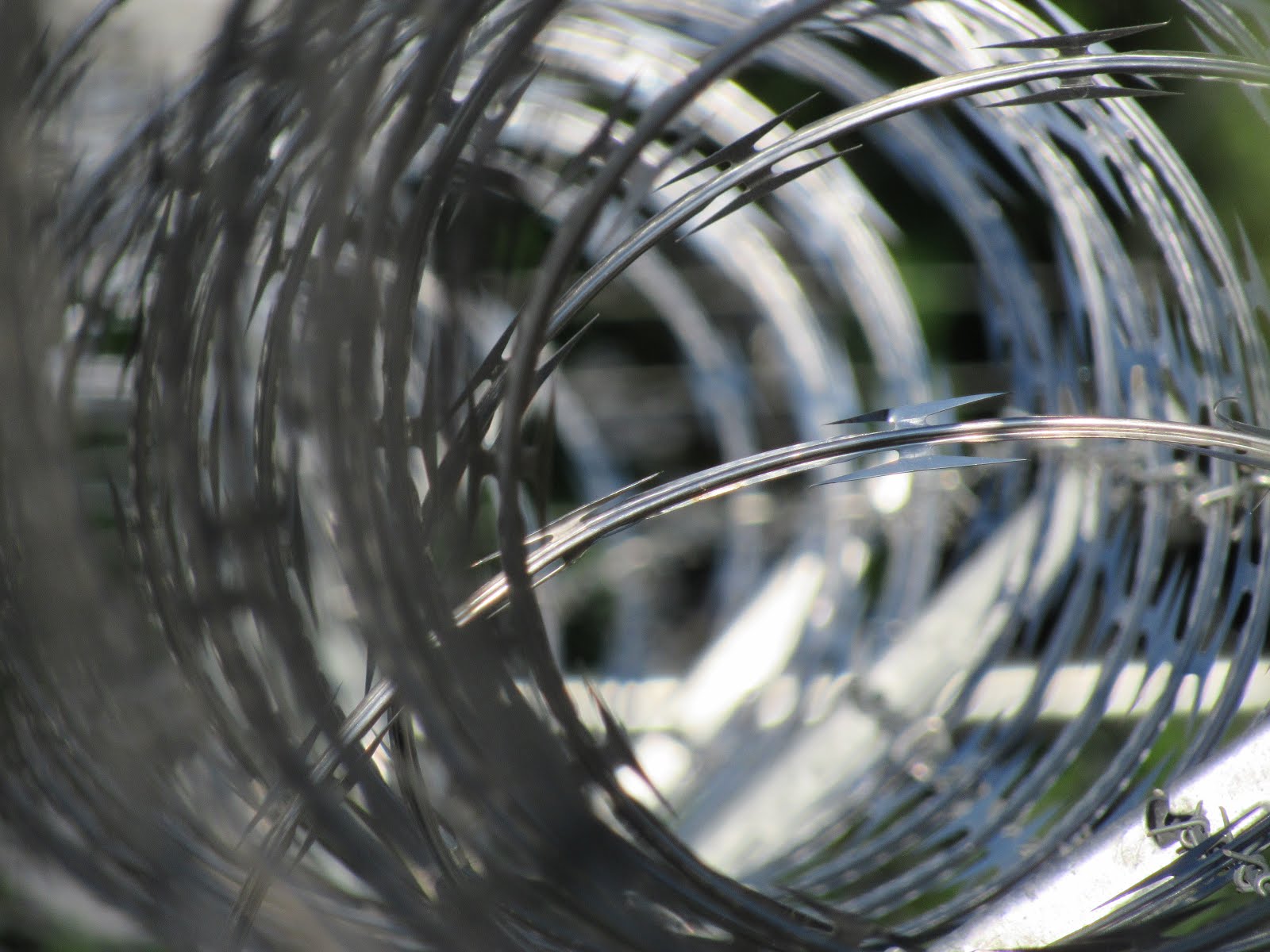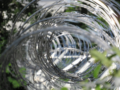 Before we left, I took some pictures at the hotel. Out back, there was a fence with barbed wire on it. It was hard to see what it was protecting… Cars, I think. But I really liked the way the barbed wire looked.