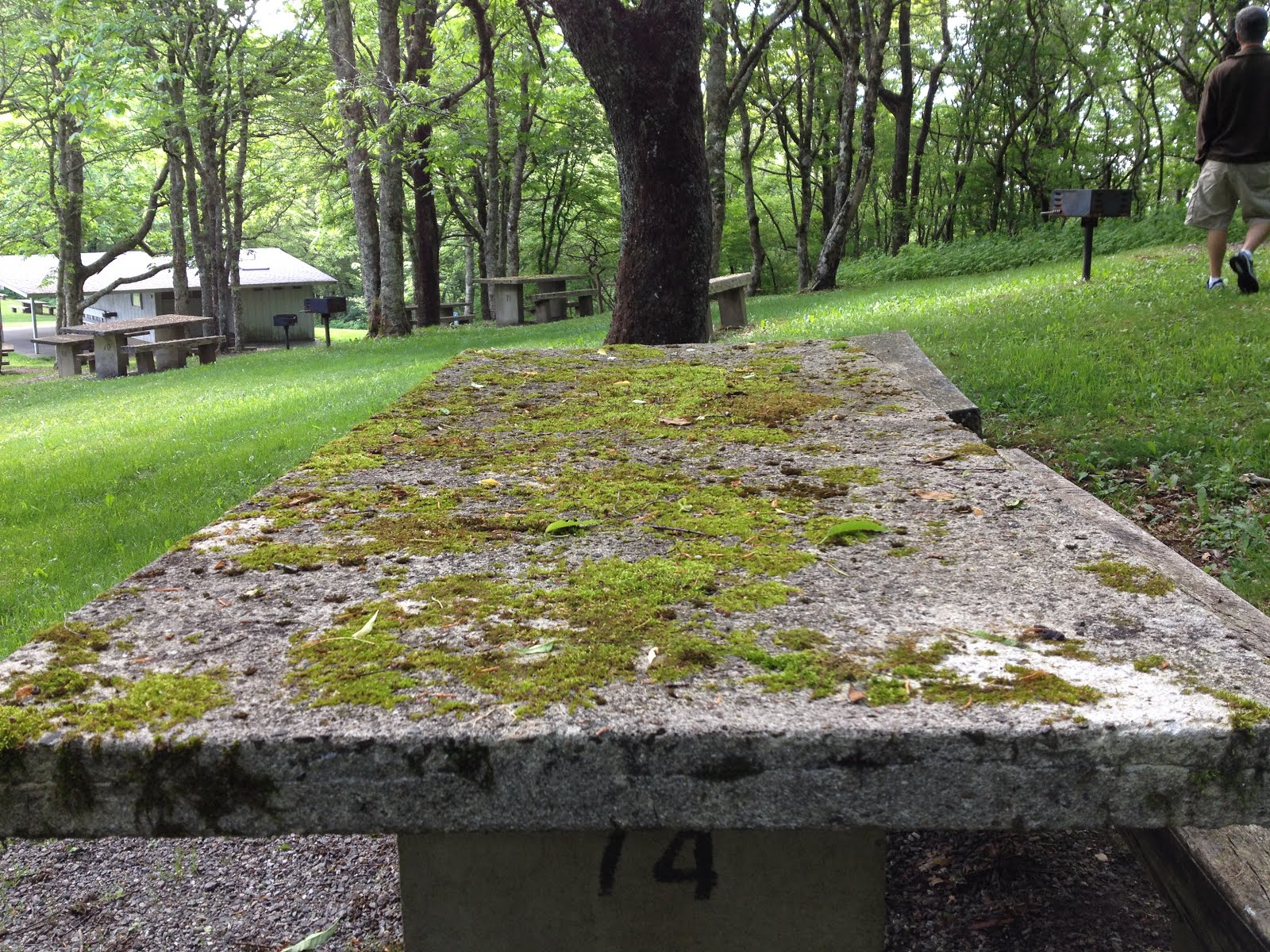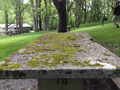 We explored a popular park where all the stone picnic tables were covered with moss.