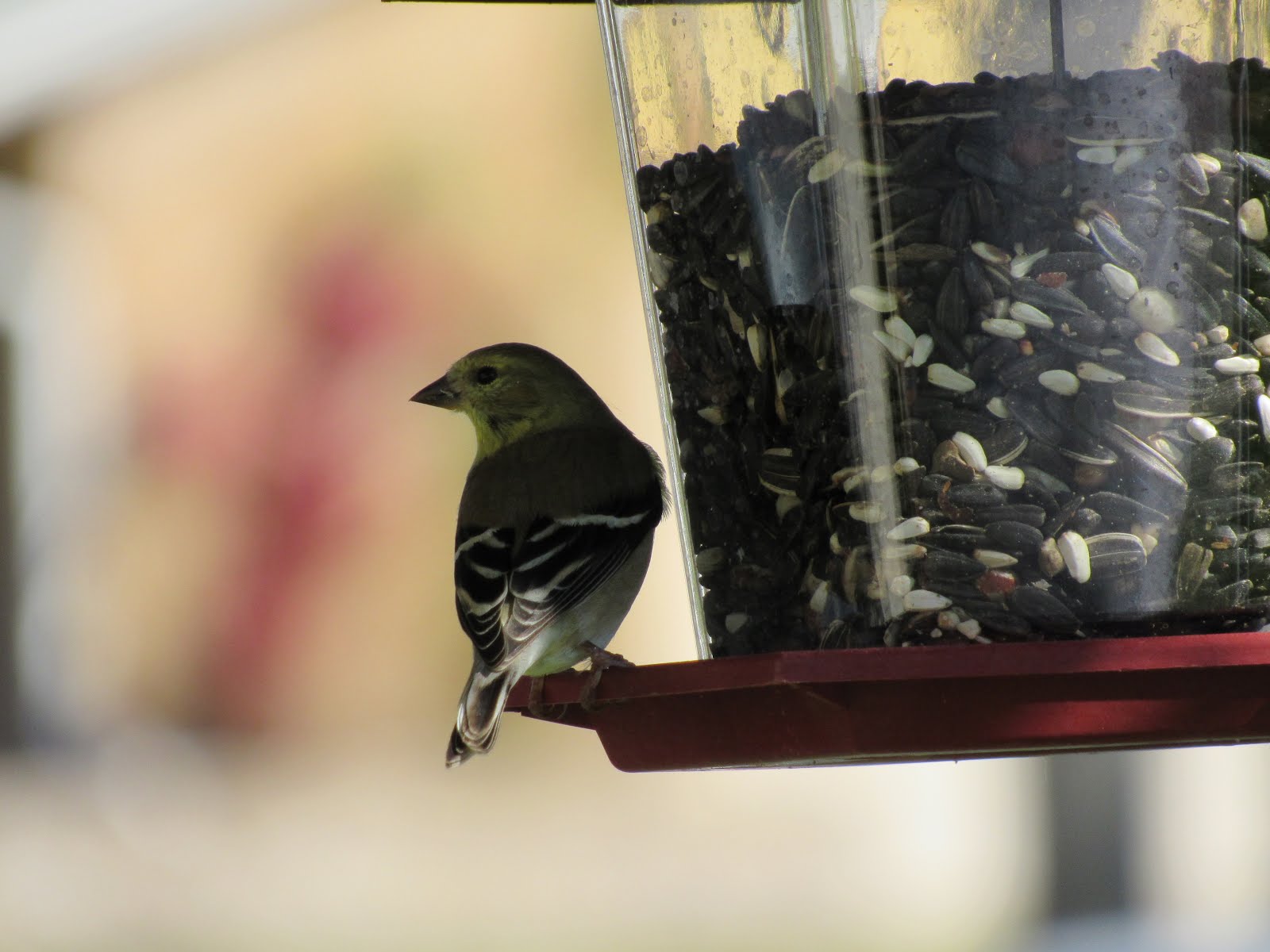 We think it’s the American goldfinch, because the bill doesn’t look dark enough for the lesser goldfinch.