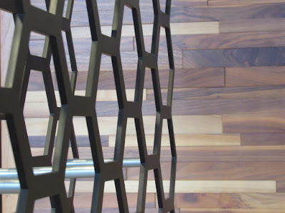 This is the base of a table in the lobby. Very cool. The weirdness behind and reflected in the golden slats is the carpet design.