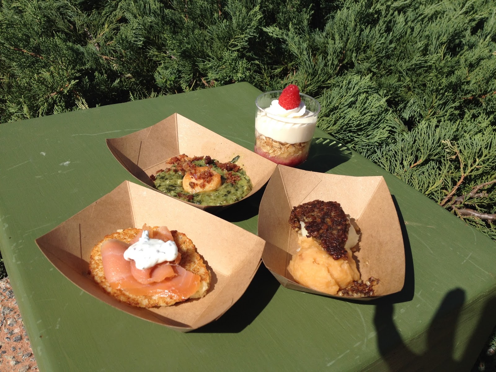 I think that’s my ghostly hand in the bottom right of the picture. Anyway, the description of the haggis this year said “traditional,” but at the booth, it said “vegetarian.” So, I’m thinking I still haven’t had true haggis. It was so yummy, with just a tad bit of liver taste to it. Reminds me of scrapple. Love me some scrapple. The spinach cheddar gratin was so-so–cheesy with a grassy aftertaste; I wouldn’t eat it all by itself, but it paired nicely with the scallop and bacon crumbles.