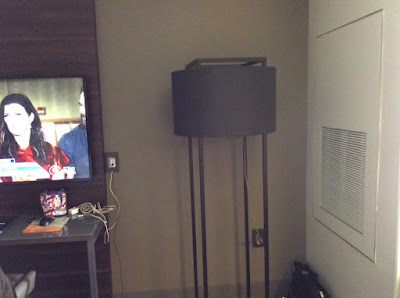 And next to the desk is this bizarre lamp that’s just taking up space that could have been used for a desk so that the television could be free for viewing by everyone in the room without the chance of a head in front of it.