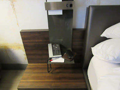 Are you kidding me? What are we supposed to be able to put there? At least they hung these stupid tables over a raised platform so that we could put more stuff by the bed without it having to be on the floor. But still. I call foul.
